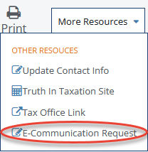 If you would like to request to receive electronic communication, please select the “E-Communication Request” option from the “More Resources” drop-down on the property search results from any property you own.