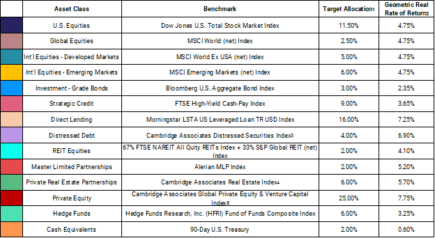 - Geometric real rates of return equal the expected return for the assets class minus the assumed inflation rate of 2.2%, per Cliffwater’s 2025 capital market assumption.